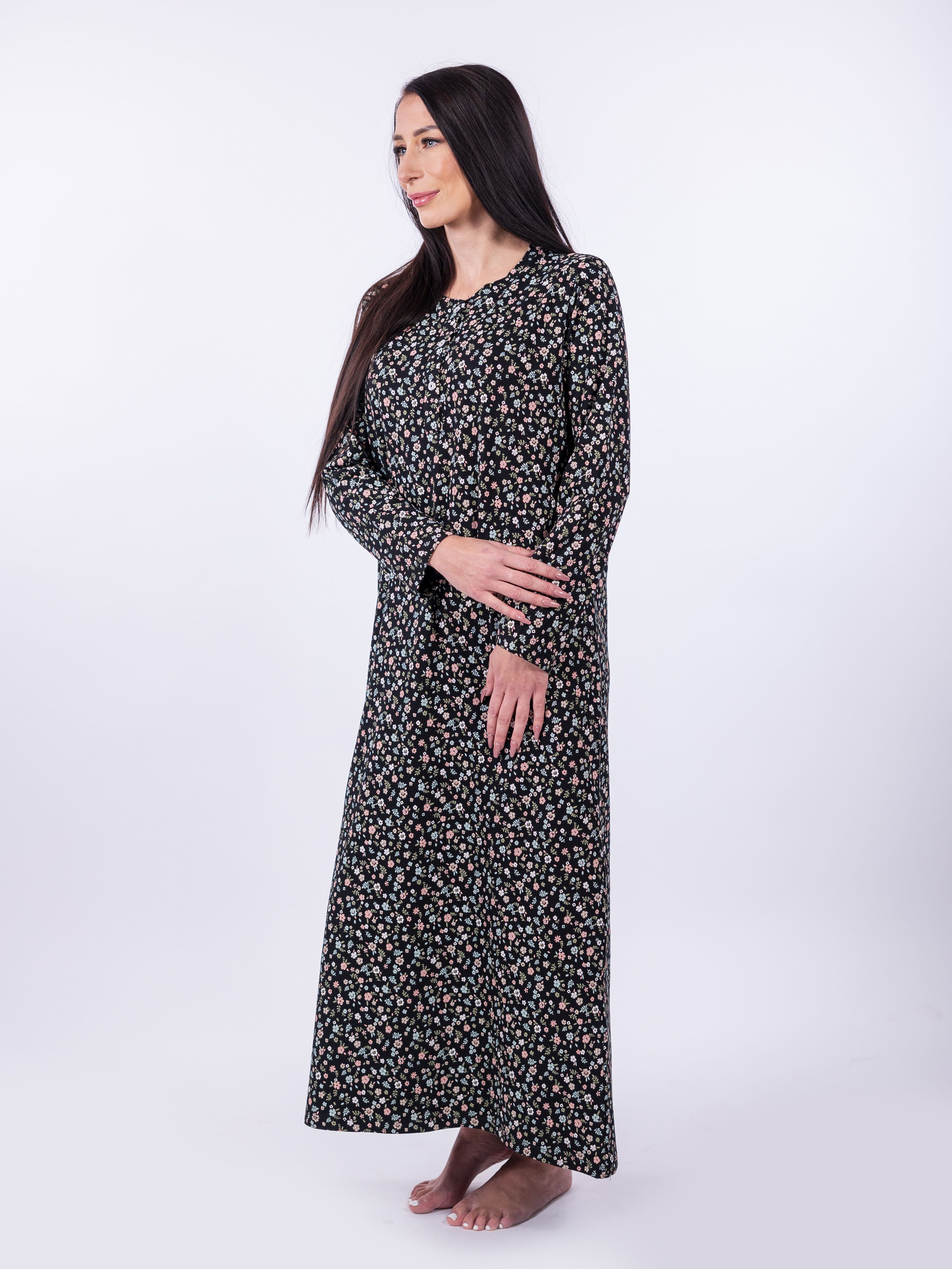 Noční košile **Fanny** je ztělesněním pohodlí a elegance pro chladnější noci. Díky složení ze **100% bavlny** je maximálně jemná a prodyšná, což zaručuje příjemný pocit na pokožce a pohodlí po celou noc. Košile má **dlouhý rukáv** a sahá **až ke kotníkům**, takže vás udrží v teple i v chladnějším počasí. **Výstřih s knoflíčky** umožňuje snadné oblékání a dodává jí elegantní vzhled. **Volný střih** zaručuje volnost pohybu a pohodlí pro každodenní spaní i relaxaci.
