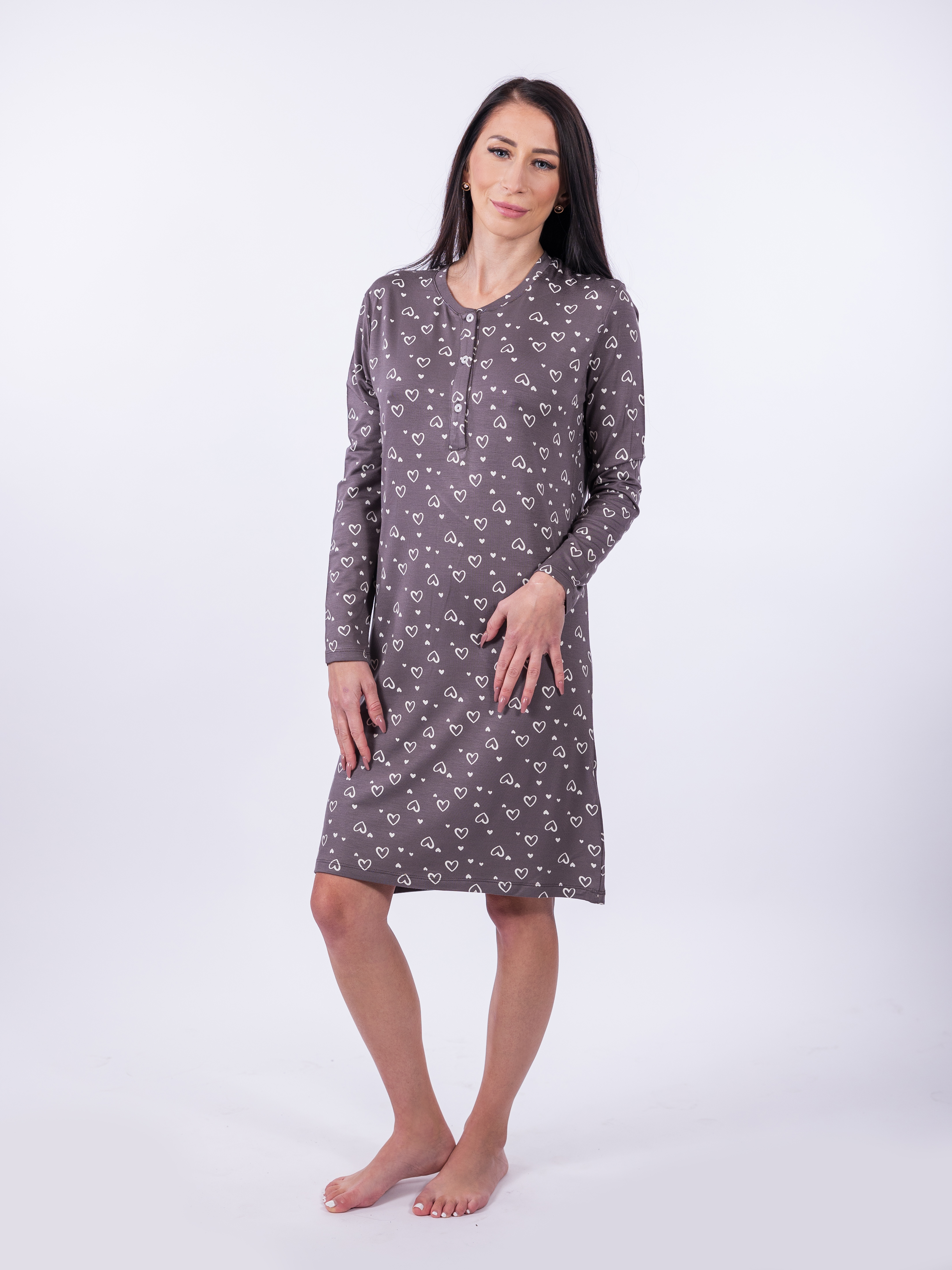 Noční košile RAMONA je ideální volbou pro ženy, které si potrpí na styl i komfort. Tato šedá košile s dlouhým rukávem a jemným vzorem srdíček je vyrobena z kvalitního a příjemného materiálu, který poskytuje pohodlí a volnost při pohybu. Elegantní knoflíčky u výstřihu dodávají noční košili moderní a zároveň praktický detail. Tato noční košile je skvělým dárkem pro všechny ženy, které ocení pohodlí a vkusný design. Užívejte si klidné a stylové noci s noční košilí RAMONA!