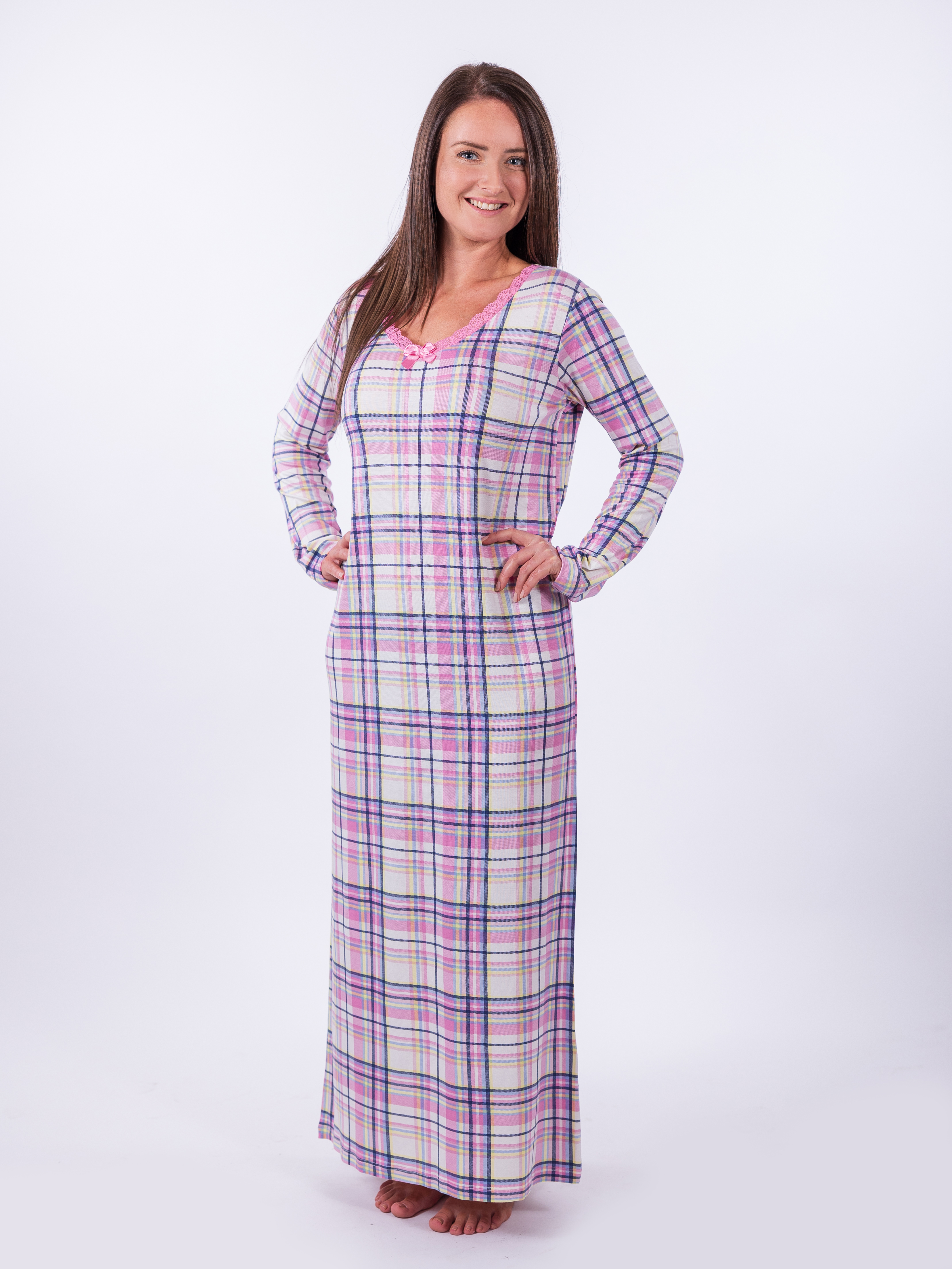 Dámská noční košile s dlouhým rukávem, ke kotníkům zdobená růžovou krajkou v oblasti krku. Tento model kombinuje moderní design s kvlitním materiálem. Ideální volba pro Vaše pohodlí a ideální spánek. Česká výroba garantuje dlouholetou životnost.