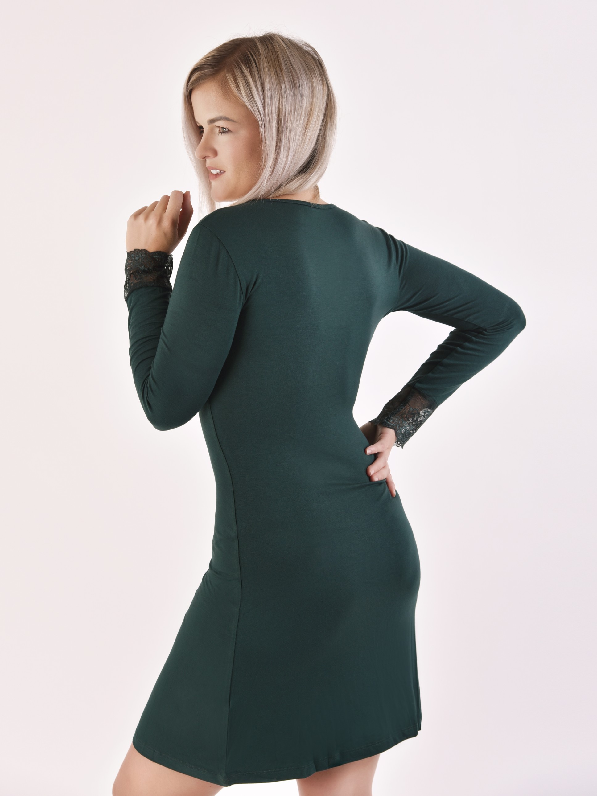 Noční košilka Anais z měkké viskózy v elegantní tmavě zelené barvě. Hluboký výstřih do „V“ je zdobený jemnou krajkou, která dodává ženský vzhled, aniž by byla příliš odhalená. Stejná krajka je i na manžetách rukávů. Příjemná viskóza krásně splývá, je prodyšná a pohodlná na celonoční nošení.