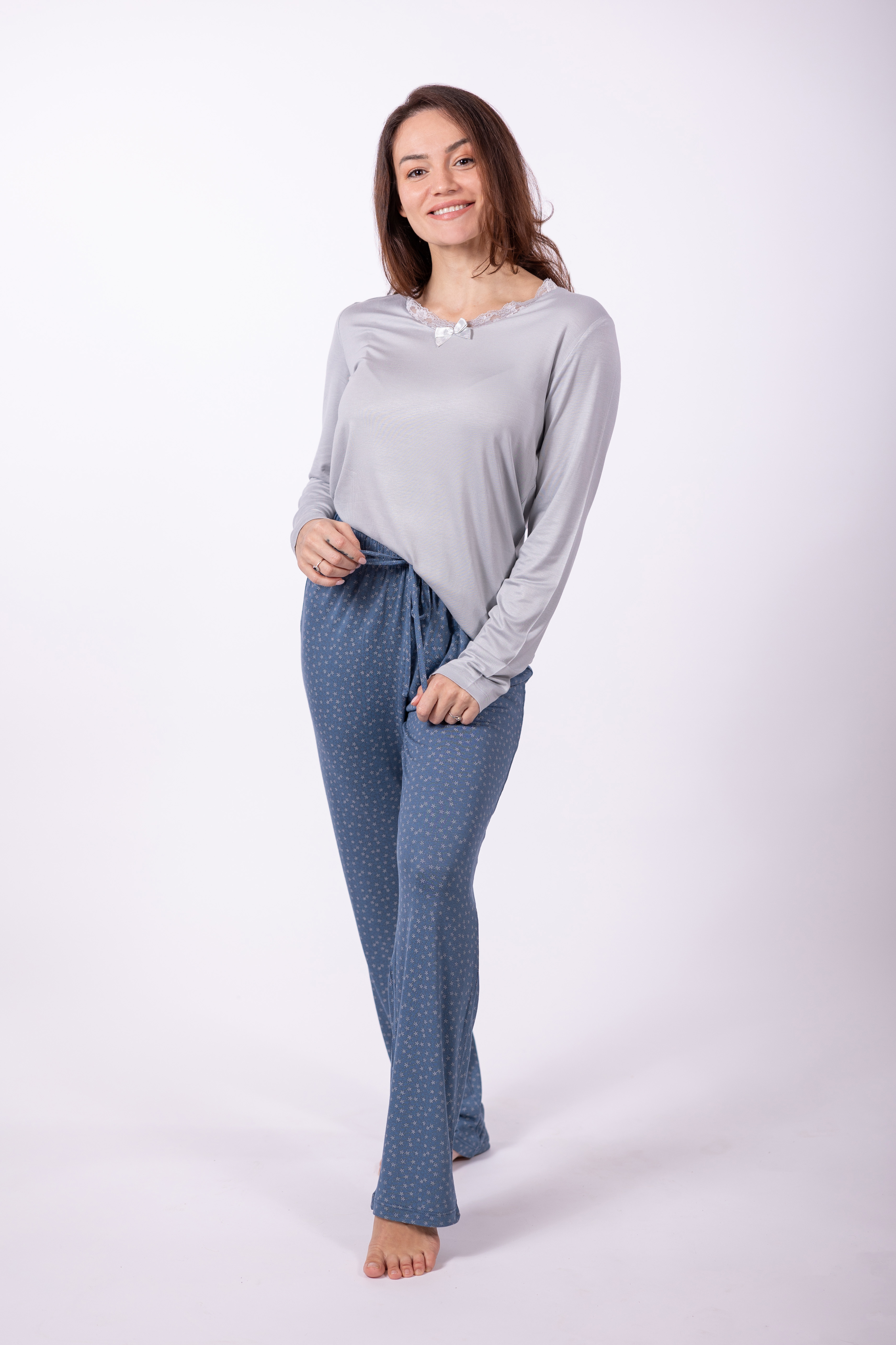 Nová kolekce 2022/2023 nabízí pyžamo v aktraktivním designu z extra jmené a kvalitní viskozy. Pohodlné doulhé kalhoty spolu s trikem s dlouhým rukávem jsou ideální volbou jak pro spánek, tak pro domácí nošení. Vybírat můžete od velikost S až po XXXL.