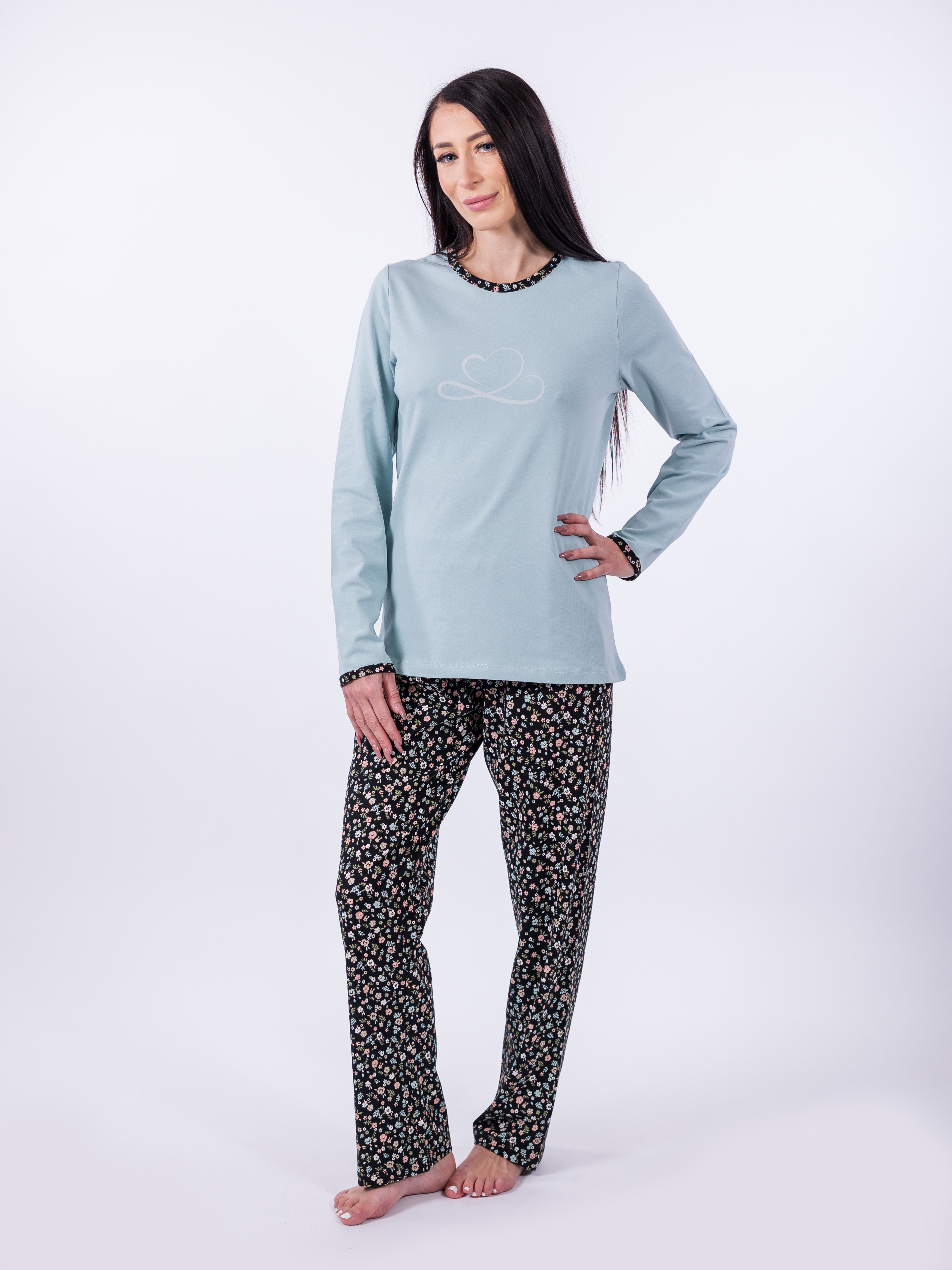 Užijte si pohodlí a eleganci s pyžamem JULIE, které kombinuje jemnou modrou halenku s dlouhými rukávy a dlouhé kalhoty s jemným květinovým vzorem. Toto dvoudílné pyžamo je ideální pro pohodlný spánek i domácí relaxaci. Vyrobeno z příjemné směsi bavlny a elastanu (95% bavlna, 5% elastan), zajišťuje maximální pohodlí a prodyšnost. Dopřejte si pyžamo JULIE jako dokonalý doplněk svého nočního šatníku.