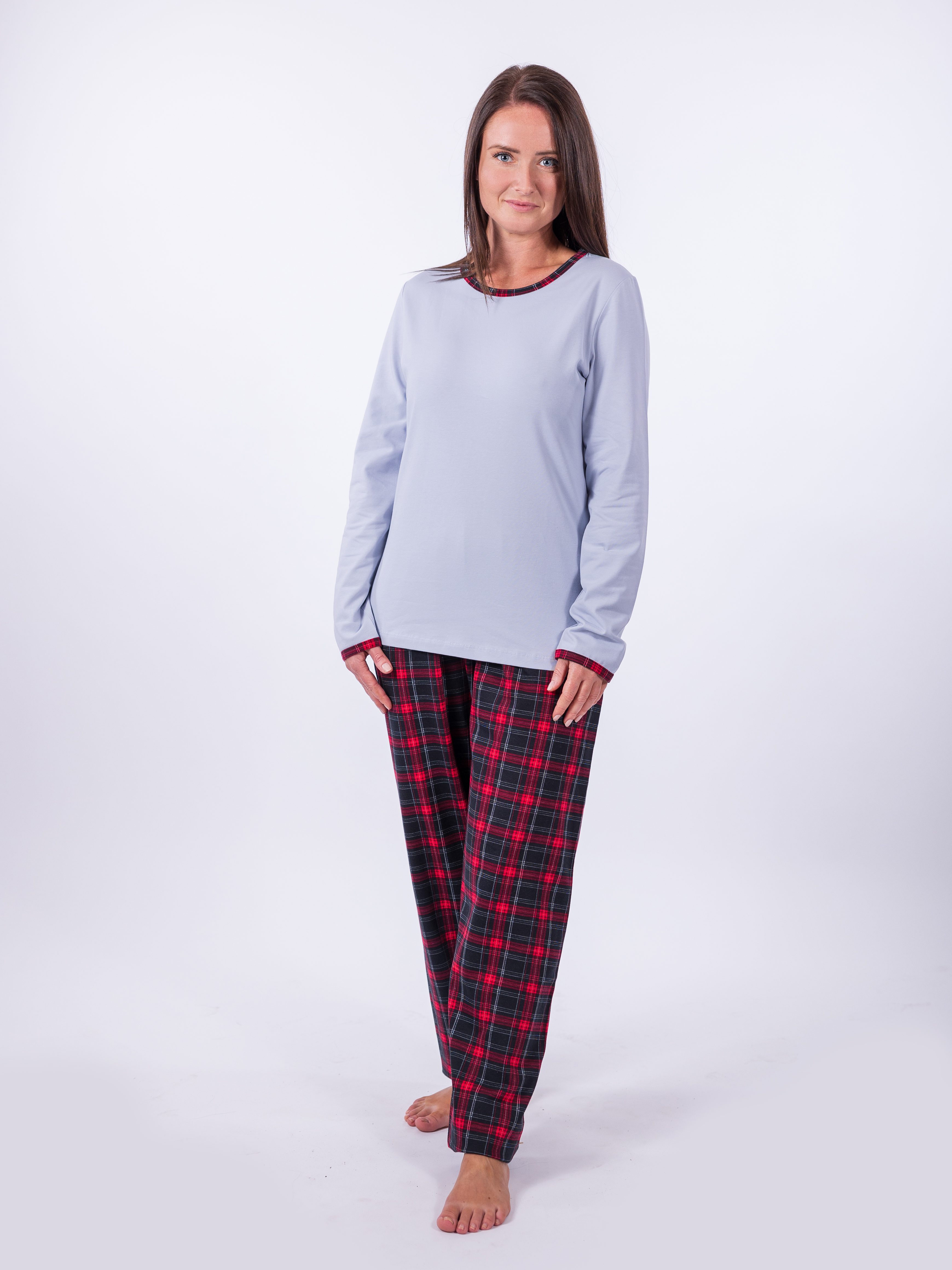 Užijte si pohodlí a eleganci s pyžamem JULIE, které kombinuje jemnou modrou halenku s dlouhými rukávy a dlouhé kalhoty s červeno-černým kostičkovaným vzorem. Toto dvoudílné pyžamo je ideální pro pohodlný spánek i domácí relaxaci. Vyrobeno z příjemné směsi bavlny a elastanu (95% bavlna, 5% elastan), zajišťuje maximální pohodlí a prodyšnost. Dopřejte si pyžamo JULIE jako dokonalý doplněk svého nočního šatníku.