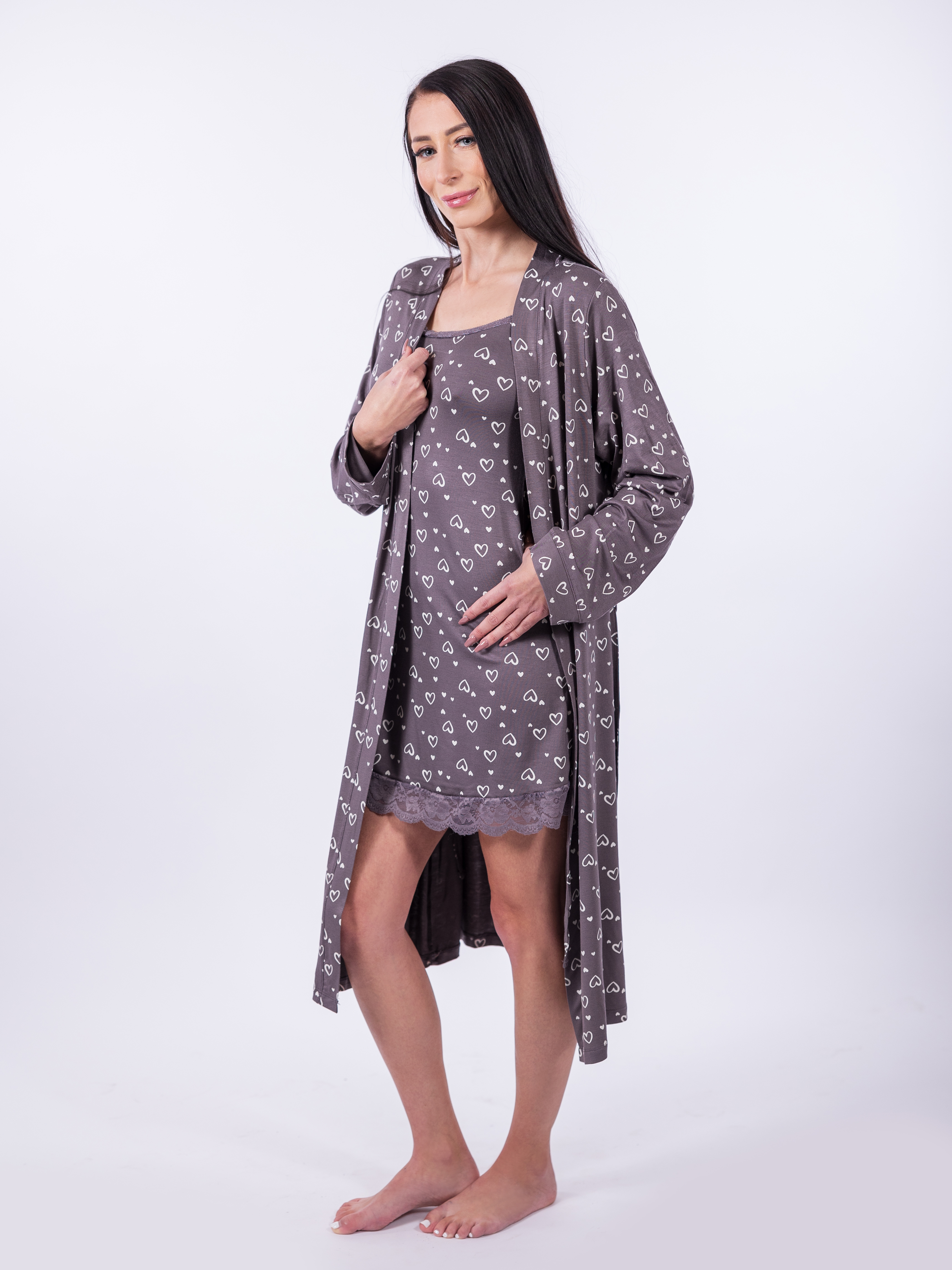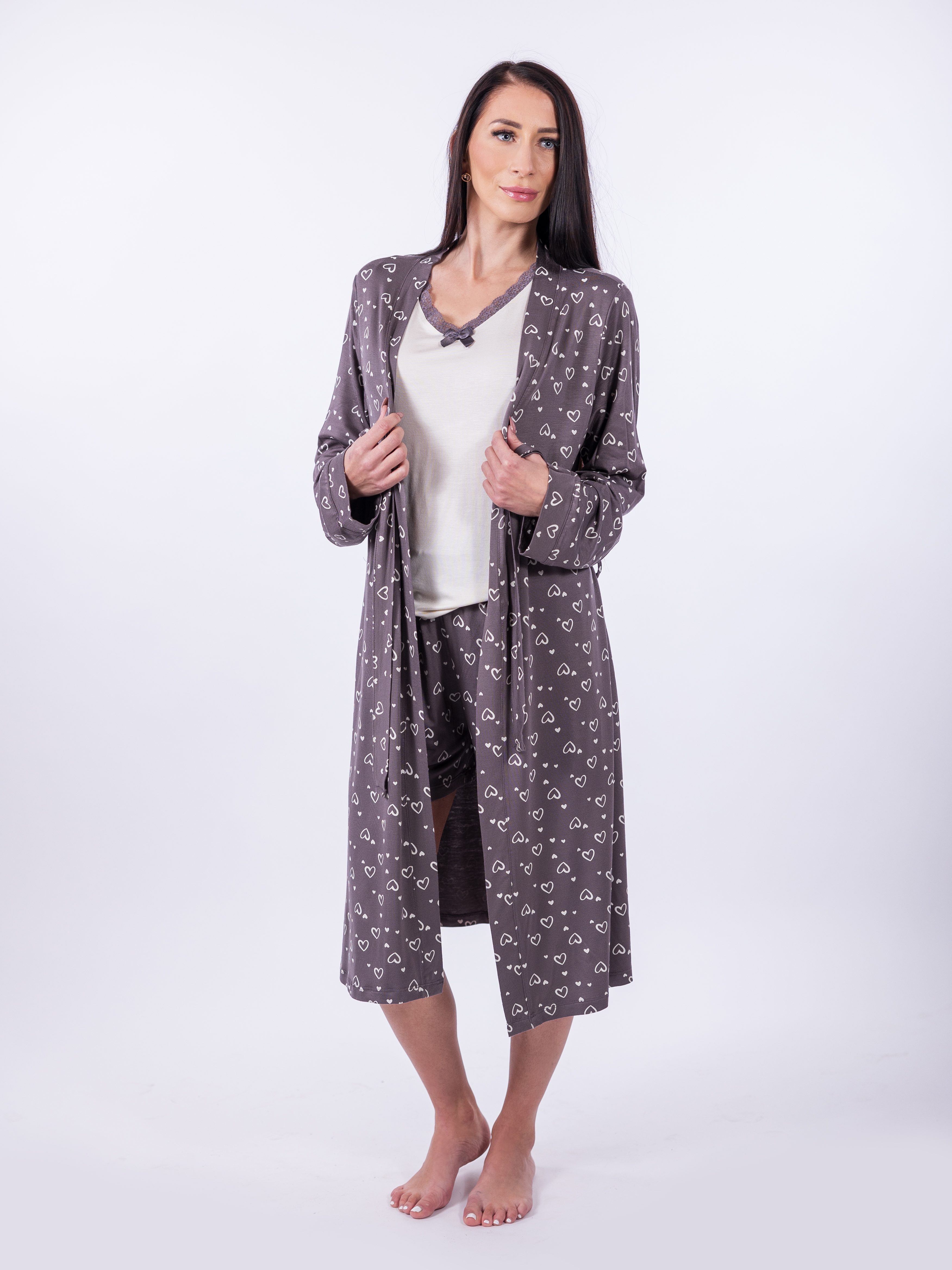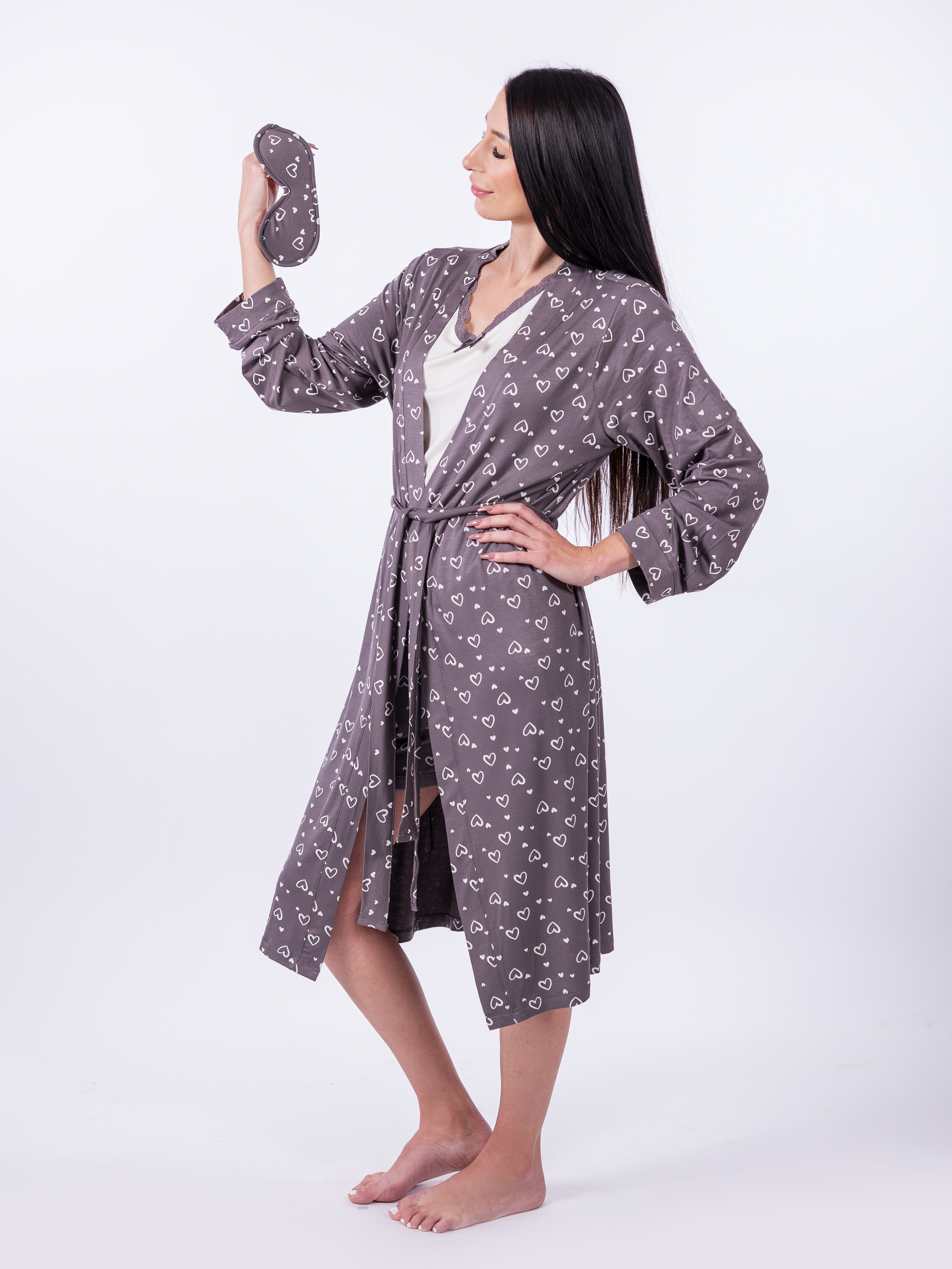 Objevte eleganci a pohodlí s dlouhým županem VIVIANE, který je ideální volbou pro každodenní relaxaci a komfort po koupeli. Tento stylový župan v šedé barvě s jemným vzorem srdíček je vyroben z příjemného materiálu, obsahujícího 95 % viskózy a 5 % spandexu, což mu dodává jemnost a pružnost. Župan má volný střih s dlouhými rukávy, který vám zajistí pohodlí i při delším nošení. Díky univerzálnímu designu jej snadno sladíte s nočním prádlem nebo pyžamem. Dopřejte si styl a komfort s županem VIVIANE a vytvořte si doma svůj vlastní wellness!